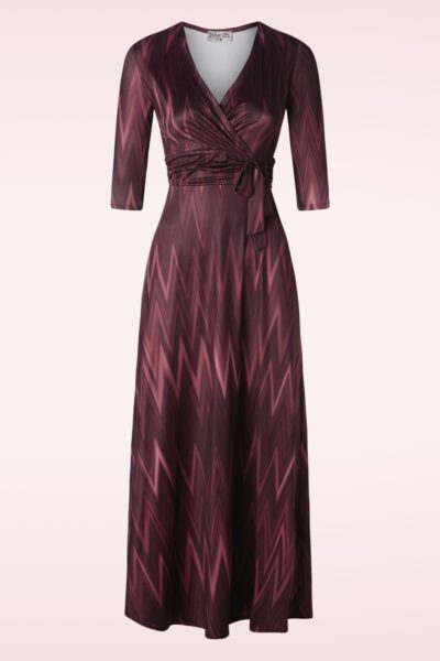 ”Zig a zig ah… !” Fresia heeft een prachtige aansluitende overslag top, 3/4 mouwen en een flatterende geplooide tailleband met een decoratief strikje. Vanaf de taille gaat ze over in een chique lange maxi rok. Ze is uitgevoerd in een glad en licht glanzend, soepel en stretchy, slinky stofje in wijnrood met een retro zigzag print. * Maxi jurk * Vaste overslag * Gevoerde top * 3/4 mouwen * Geplooide tailleband met vaste strikbandjes * Rok is gedeeltelijk gevoerd * Geen rits of knopen; aantrekken en ready to go! * Reikt tot op de enkel bij een lengte van 1,70 m