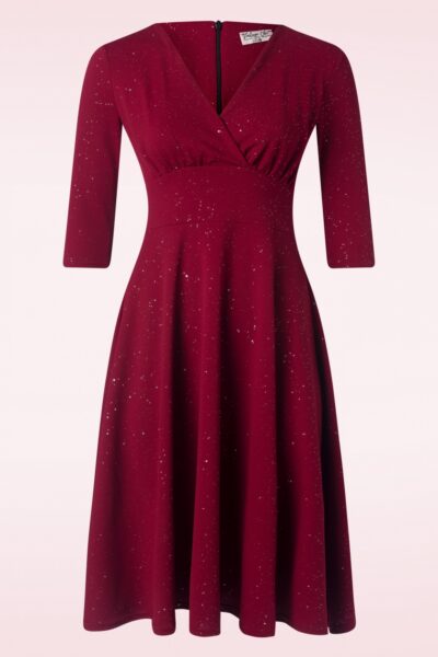 Feestdagen of gewoon een dagje full glamour? Glinda is jouw sidekick! Uitgevoerd in een soepele en stretchy, wijnrode stof voorzien van zilverkleurige glitters. “Glinda is all glitz and glam honey!” * Swing model * Vaste, geplooide overslag * 3/4 mouwen * Brede tailleband * Blinde rits achterzijde * Valt bij een lengte van 1,70 m over de knie