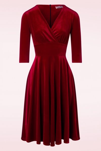 Deze 50s Maddison Swing Jurk in Rood Fluweel is een droom van een jurk! Deze droomjurk heeft een elegante geplooide overslag, 3/4 mouwen en een brede tailleband die je taille perfect benadrukt. Vanaf de taille loopt ze uit in een zwierige swing rok waardoor er een super vrouwelijk silhouet ontstaat. Uitgevoerd in een soepele en stretchy, zachte, dieprode fluwelen stof die heerlijk draagt. “Stop dreaming and start ordering!”   * Swing model * Gevoerde top * Vaste geplooide overslag * 3/4 mouwen * Brede tailleband * Blinde rits achterzijde * Valt bij een lengte van 1,70 m over de knie