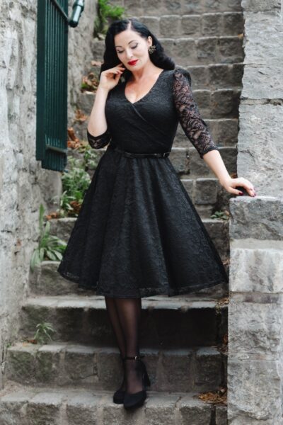 Beauty Margaret is een elegante must-have voor iedere gelegenheid. Ze heeft een aansluitende overslagtop met 3/4 doorzichtige kanten pofmouwen en een afneembare lakriem in de taille, die een prachtig silhouet creëert. Vanaf de taille loopt ze over in een zwierige swingrok, uitgevoerd in een licht stretchy zwart stofje met een doorzichtige kanten laag voor een adembenemend effect. Perfect voor een chique en vrouwelijke look! * Swing model * Vaste oveslag * Volledig gevoerd (m.u.v. de mouwen) * 3/4 pofmouwen * Afneembare lak riem * Geen rits of knopen * Valt bij een lengte van 1,70 m over de knie * Ava is 1,69 m