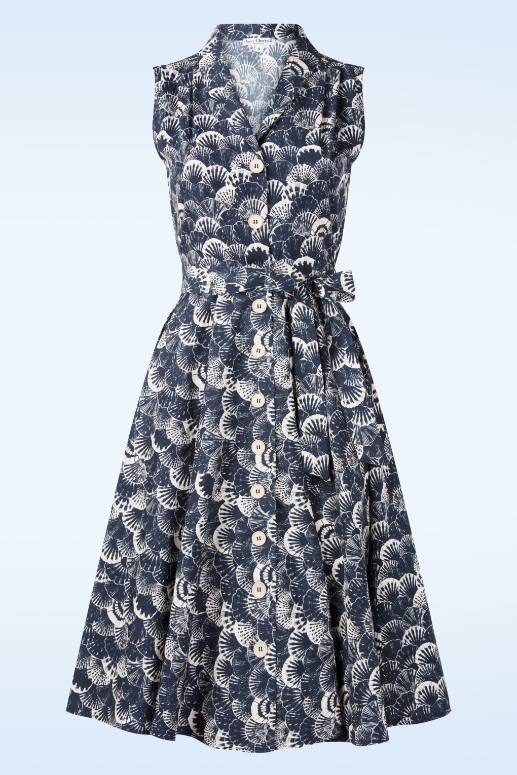 ”You’re very spe-shell!” Deze zomerse jurk is perfect voor het komende seizoen! Ze is uitgevoerd in een soepele en luchtige, donkerblauwe 100% katoen (stretcht niet) voorzien van een schelpenprint in gebroken wit. * Semi-swing model * V-halslijn met afgerond kraagje * Mouwloos * Knopenrij * It has pockets! * Afneembaar striklint voor een extra ‘snatched’ taille * Valt bij een lengte van 1,70 m ruim over de knie