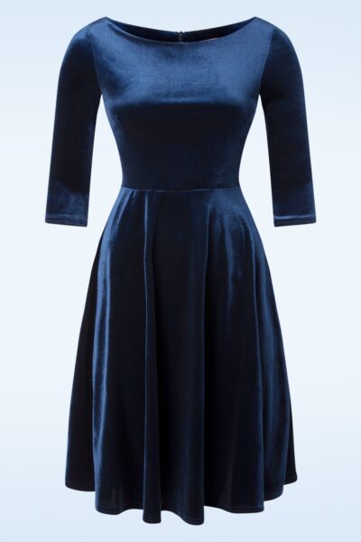 ”Oh la la… who’s that lady in velvet?!” Jij natuurlijk! Uitgevoerd in een prachtig zacht, stretchy, navyblauw stofje met de luxe look and feel van fluweel dat heerlijk draagt. * Swing model * Boothals * Gevoerde top * 3/4 mouwen * Geplooide rok * Blinde rits achterzijde * Valt bij een lengte van 1,70 m op de knie