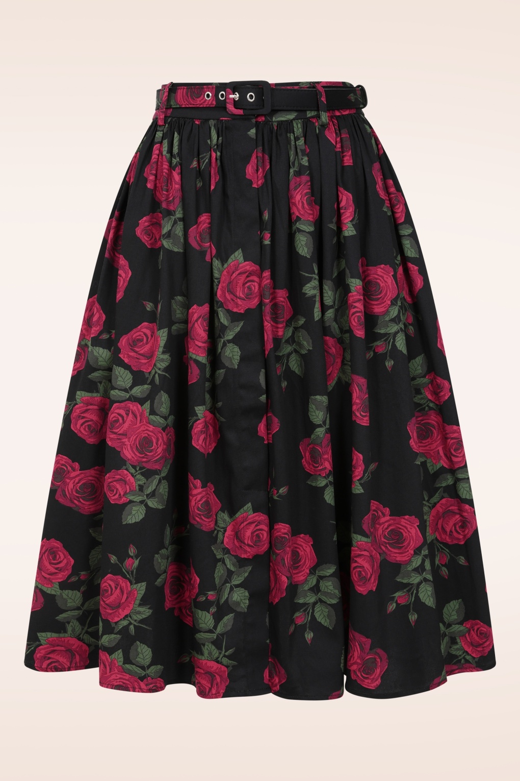 “A swing of roses, bold and unforgettable.” Deze swing rok met knopen wordt hoger in de taille gedragen waardoor er een super vrouwelijk silhouet ontstaat. Ze is uitgevoerd in een soepel vallende, 100% katoen in zwart (stretcht niet!) met een klassieke print van rode rozen. * Full swing rok * Zijwaartse steekzakjes * Knoop- en haaksluiting voorzijde * Riemlusjes * Afneembare matching riem * Kan gecombineerd worden met een van onze petticoats * Valt bij een lengte van 1,70 m over de knie