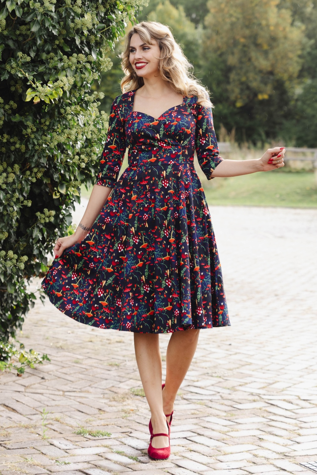 “Autumn chic, leaf it to me!” Deze beauty is exclusief bij Topvintage verkrijgbaar! Het aansluitende lijfje heeft een prachtige sweetheart halslijn met overslag, 3/4 mouwen en vanaf de taille loopt ze uit in een zwierige swing rok waardoor jij een super vrouwelijk silhouet krijgt. Uitgevoerd in een stevige maar soepel vallende donkerblauwe katoenmix, voorzien van een herfstachtige print met paddenstoelen die door onze eigen in-house designers ontworpen is. * Full swing model * Sweethearts halslijn met vaste overslag * 3/4 mouwen * Zijwaartse steekzakken * Blinde rits achterzijde * Valt bij een lengte van 1,70 m over de knie * De print is door onze eigen in-house designers ontworpen * Melissa is 1,78 m