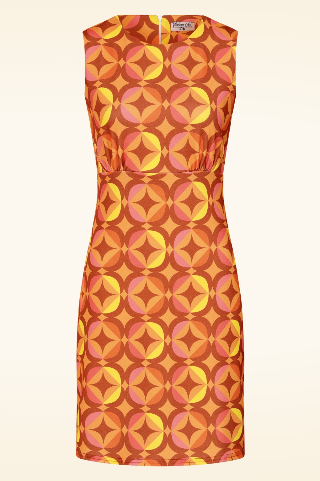 ‘I see it, I like it, I want it, I got it!’ Betty is uitgevoerd in een iets dikkere, stretchy crêpe-achtige stof met een groovy geometrische print in oranje- en geeltinten. Ze zit heerlijk en draagt minstens zo fijn als ze eruitziet. * A-lijn model * Gevoerde top * Blinde rits achterzijde * Valt bij een lengte van 1,70 m net boven de knie * Exclusief bij Topvintage verkrijgbaar