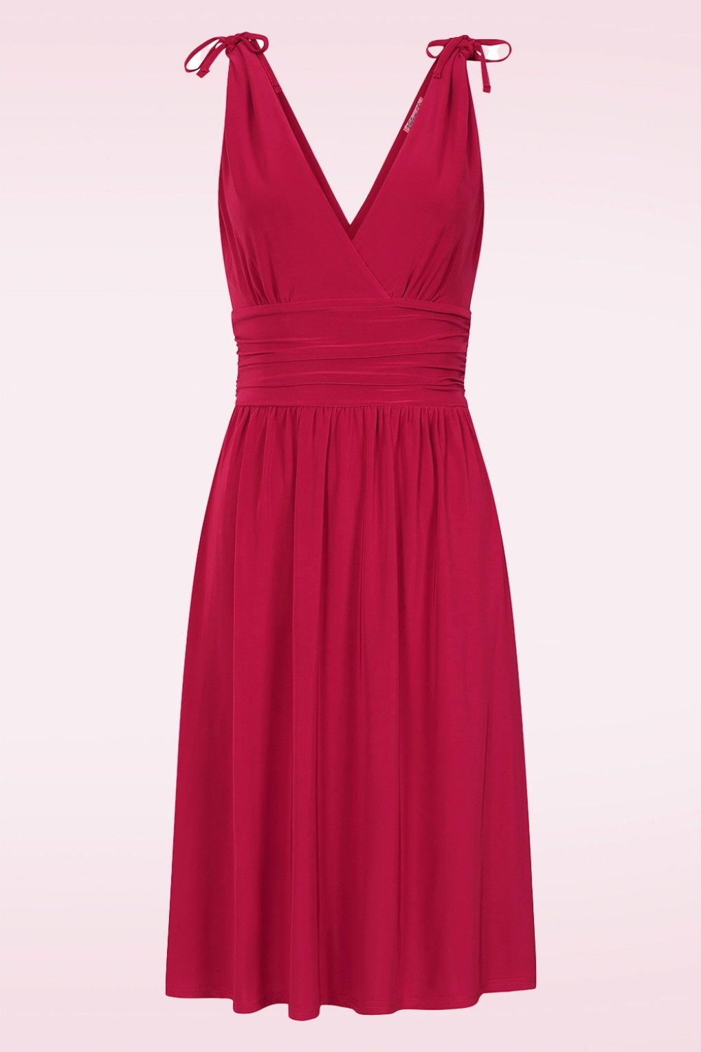 “The Grecian dress in red: fluid, effortless, impossible to ignore.” De top heeft zowel aan de voor- als achterzijde een diepe V met mooie overslag, waardoor je een sexy decolleté laat zien, oh la la! De licht geplooide cups lopen door in brede schouderbandjes met een speels strikdetail op de schouder. Uitgevoerd in een glad, soepel en stretchy slinky dieprood stofje, dat heerlijk comfortabel draagt. * Zwierig model * Gevoerde top * Vaste overslag * Vaste strikbandjes * Flaterende geplooide tailleband * Geen rits of knopen; aantrekken en ready to go! * Valt bij een lengte van 1,70 m over de knie * Exclusief bij Topvintage verkrijgbaar