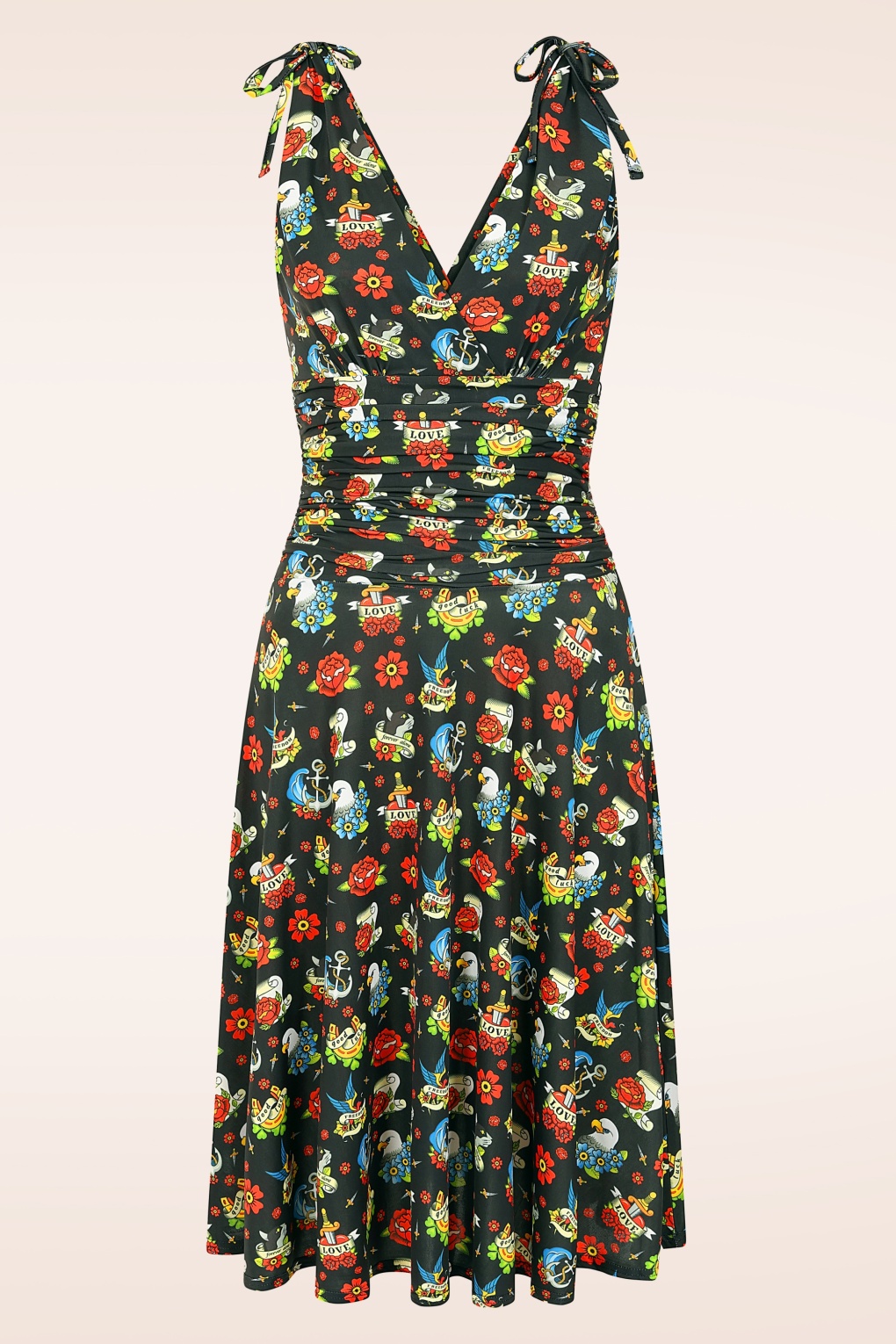 “Ink your style.” In deze Grecian Tattoo jurk blijf je zeker niet onopgemerkt! De top heeft zowel aan de voor- als achterzijde een diepe V met mooie overslag, waardoor je een sexy decolleté laat zien, oh la la! De licht geplooide cups lopen door in brede schouderbandjes met een speels strikdetail op de schouder. Uitgevoerd in een glad, soepel en stretchy slinky zwart stofje met een print van old school tatoo’s, dat heerlijk comfortabel draagt. * Zwierig model * Gevoerde top * Vaste overslag * Vaste strikbandjes * Flaterende geplooide tailleband * Geen rits of knopen; aantrekken en ready to go! * Valt bij een lengte van 1,70 m over de knie * Exclusief bij Topvintage verkrijgbaar