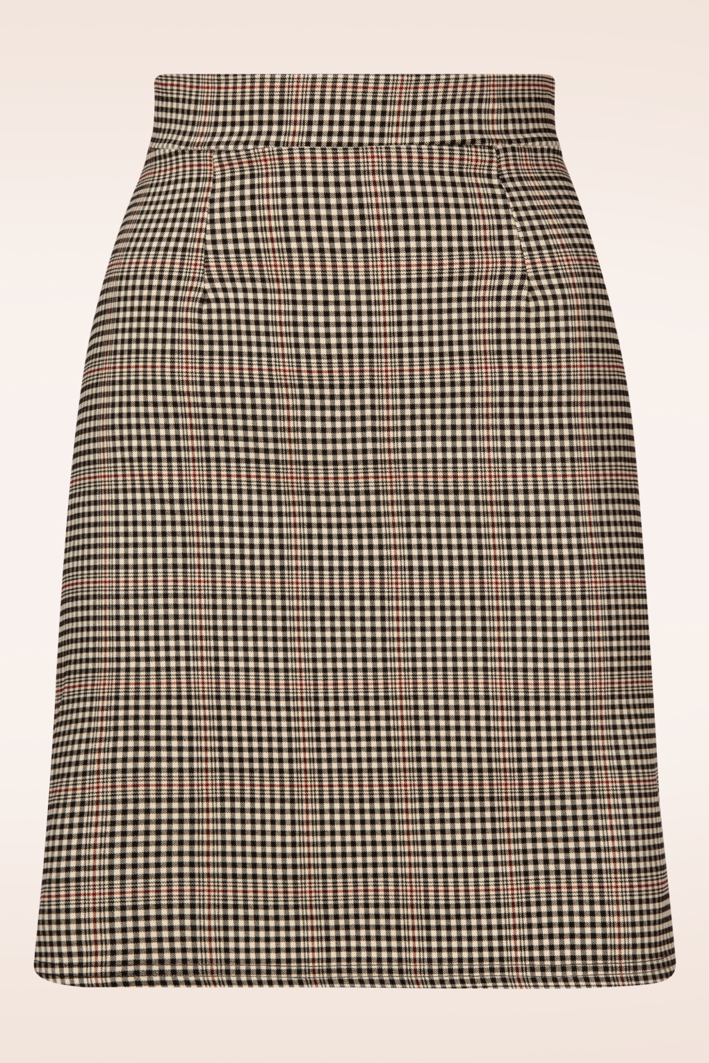 “Checks and charm above the knee.” Lina wordt hoog in de taille gedragen vanwaar ze uitloopt in een speels A-lijntje. Uitgevoerd in een stevige maar stretchy, beige, bengaline achtige stof met een ruitje in zwart en een vleugje rood. * A-lijn * Blinde rits achterzijde * Valt bij een lengte van 1,70 m boven de knie * Exclusief bij Topvintage verkrijgbaar