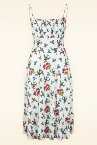 ”She’s giving us real retro vibes!” Groovy Tammy heeft een prachtige aansluitende overslag top met flatterende plooitjes, korte vlindermouwtjes, loopt vanaf de taille over in een flowy maxi rok en is voorzien van een kleurrijk retro printje in roze, groen en bruintinten. Je neemt haar tevens probleemloos óveral mee naartoe… ze is namelijk uitgevoerd in een soepele en stretchy, slinky stof met een lichte glans die licht van gewicht is en niet kreukt. * Vaste overslag met plooitjes * Gevoerde top voor extra comfort * Korte vlindermouwtjes * Afneembaar matching striklint * Geen rits of knopen; aantrekken en ready to go! * Reikt bij een lengte van 1,70 m tot aan de grond * Exclusief bij Topvintage verkrijgbaar
