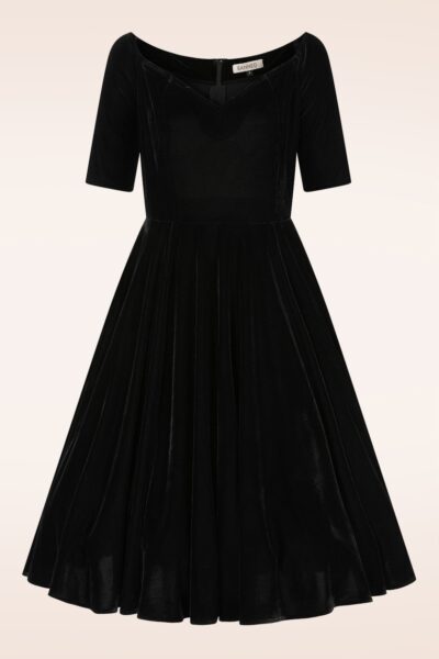 “Old Hollywood charm, modern-day confidence.” Laat je innerlijke filmdiva stralen in deze elegante swing jurk. De off-shoulder mouwtjes en subtiele sweetheart halslijn geven haar een verleidelijke, vrouwelijke uitstraling, terwijl het zwarte fluweel zorgt voor een vleugje old Hollywood glamour. De flatterende swingrok beweegt sierlijk mee bij elke stap en ze is uitgevoerd in een zachte, stretchy fluweelachtige stofmix die niet alleen prachtig oogt, maar ook heerlijk comfortabel draagt. Perfect voor een feestje, diner of een avond uit. * Swing jurk * Subtiele sweetheart halslijn met siliconen biesjes   * Korte mouwtjes met elastiek die off-shoulder gedragen kunnen worden  * Rits- en haaksluiting achterzijde * Voorzien van zakken!  * Reikt bij een lengte van 1,70 m over de knie
