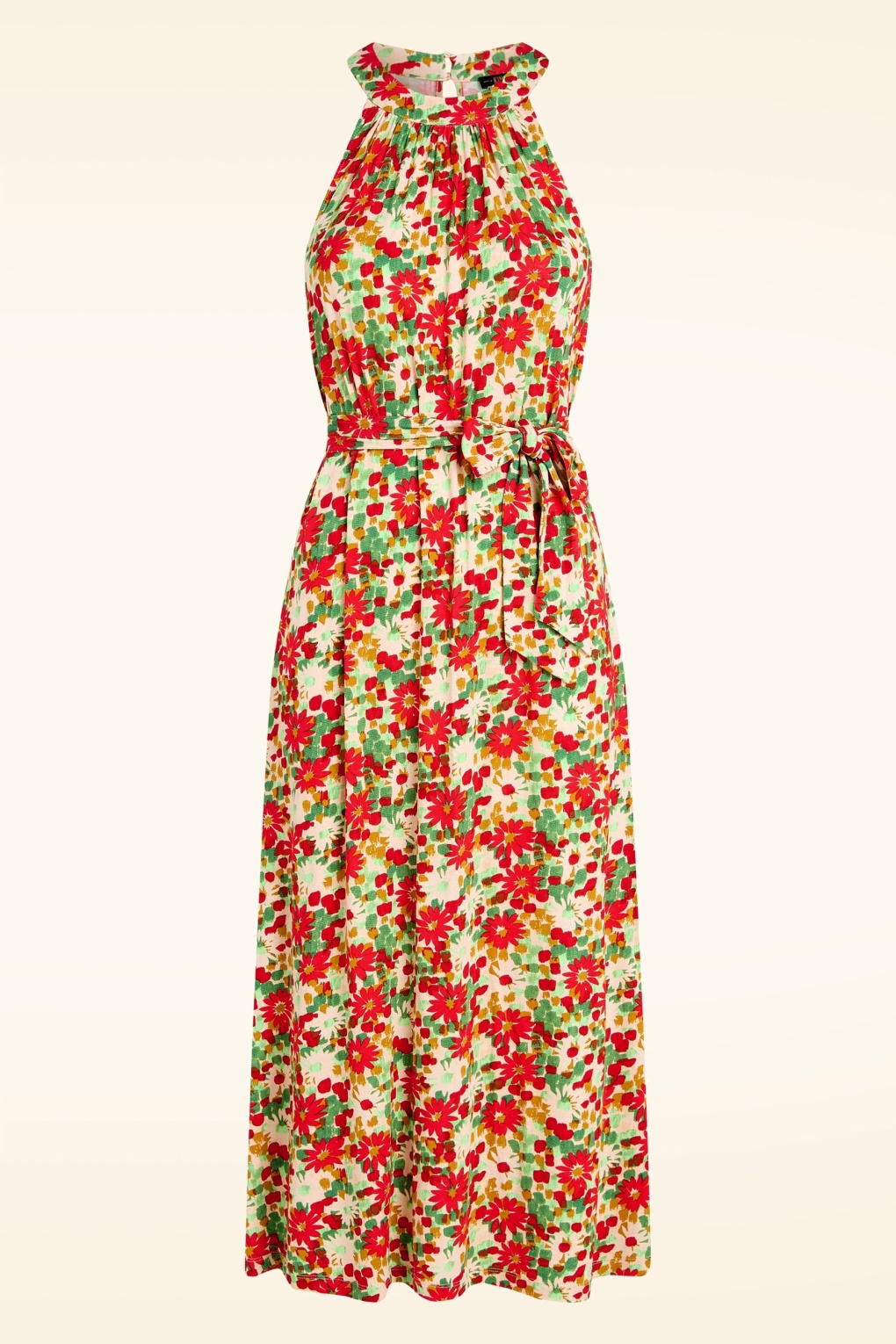 ”Bloom baby, bloom!” Gorgeous midi jurk Virna is uitgevoerd in een soepele en stretchy, zachtroze Ecovero viscosemix met een bloemetjesprint in rood en groen die een genot is om te dragen. * Midi model * Keyhole met knoopsluiting achterzijde * Afneembaar striklint voor een extra ‘snatched’ taille * Splitjes aan de zijkant * Reikt bij een lengte van 1,70 m tot halverwege de kuit * Let op; de kleur van het product op video kan afwijken van de daadwerkelijke kleur van het product