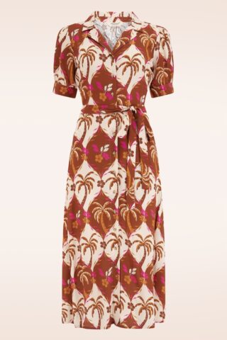 “Easy like a warm breeze through the palms.” Als de prachtige tropische bladerenprint in bruin met een vleugje roze je nog niet over de streep getrokken heeft, dan doet haar speelse midi snit dat wel. Penelope is licht getailleerd, heeft korte mouwen, een reeks knopen en is uitgevoerd in een stevige maar soepele, luchtige, non-stretchy crèmekleurige EcoVero viscose die heerlijk draagt. * Midi shirt dress * Puntig kraagje * Korte, licht poffende mouwen met knoopsluiting * Afneembaar striklint * Knopen over de hele voorzijde * Zijwaartse steekzakken * Geen rits * Reikt tot halverwege de kuit bij een lengte van 1,70 m