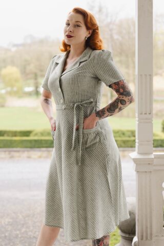 “Vintage vibes, modern charm.” Voeg wat ’fourties flair’ toe aan je garderobe met deze Revers Striped linnen midi-jurk! Ze heeft een V-halslijn met een speels reverskraagje, korte pofmouwen en een reeks grote knopen. Het striklint accentueert je taille voor een supervrouwelijk silhouet, terwijl de opgenaaide zakjes aan de voorzijde zorgen voor een speelse touch. Uitgevoerd in een luchtige, soepelvallende linnen-/katoenmix (stretcht niet) in olijfgroen met een wit streepje, die heerlijk draagt. * Semi-swing model * V-halslijn * Revers kraagje * Korte pofmouwen * Reeks knopen voorzijde * Afneembaar striklint, voor een extra ‘snatched’ taille * Zakjes voorzijde * Blinde rits aan de zijkant * Valt bij een lengte van 1,70 m halverwege de kuit