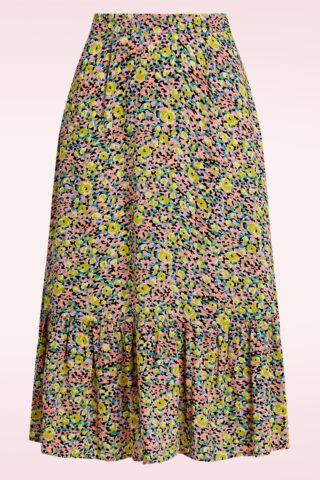 Deze Erica Senora jurk is super veelzijdig! De aansluitende top heeft een elegante V-hals, korte mouwen en een speels striklint dat je taille prachtig accentueert. Vanaf de taille loopt ze uit in een flowy rok die tot de kuit reikt en heerlijk met je meebeweegt. Ze is uitgevoerd in een aangename, soepel vallende en stretchy EcoVero viscosemix in zwart, voorzien van een retro bloemetjesprint in blauw, groen en geeltinten. * Midi jurk * V-halslijn * Knopenrij * Korte mouwen * Striklint in de taille * Valt bij een lengte van 1,70 m halverwege de kuit
