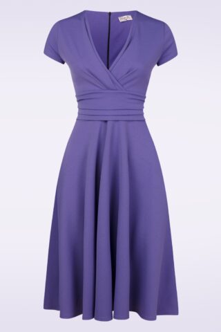 ”You can’t have a bad day in a purple dress!” Deze prachtige swing beauty Esmeralda heeft een V-halslijn met vaste geplooide overslag, korte kapmouwtjes en loopt vanaf de flatterende tailleband uit in een flowy swing rok. Ze is uitgevoerd in een iets dikkere maar soepele en stretchy, crêpe achtige stof die heerlijk draagt, niet kreukt en voorzien is van prachtige paarse kleur. * Swing model * Vaste, geplooide en gevoerde overslag top * Flatterende geplooide tailleband * Blinde rits achterzijde * Valt bij een lengte van 1.70 m over de knie