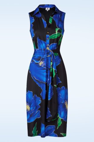 “Floral charm meets all-day comfort.” Elena is stunning om te zien en ontzettend comfortabel dankzij de soepele, stretchy en gladde slinky stof met StayFresh-coating, uitgevoerd in zwart met een prachtige blauwe bloemenprint. * Midi jurk * Puntig kraagje * Mouwloos * Volledig gevoerd * Afneembare strikriem, voor een extra ‘snatched’ taille * Valt bij een lengte van 1,70 m tot halverwege de kuit * StayFresh coating