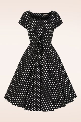 “Laced up, dotted out, and ready to steal the spotlight!” De aansluitende top heeft een ronde halslijn, korte mouwtjes en een sexy rijgdetail met een fluwelen veter aan de voorzijde. Vanaf de taille loopt ze uit in een volle swingrok met handige steekzakken, die je een prachtig silhouet geven. Ze is uitgevoerd in een stevige, maar soepel vallende zwarte katoenmix met een print van witte polkadots.” * Swing stijl * Scoop halslijn * Rijgdetail met fluwelen veter aan de voorzijde * Gevoerde top * It has pockets! * Blinde rits met haaksluiting aan de achterzijde * Valt bij een lengte van 1,70 m over de knie